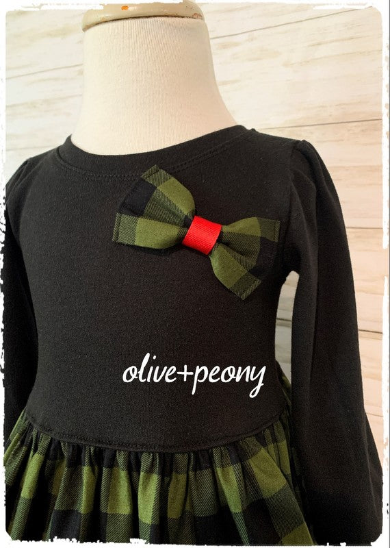We need a little Christmas right now, don’t we? This cute and comfy look can be dressed up or dressed down, perfect for an outing to the Christmas tree farm, pictures with Santa, or a cozy day opening presents with family. The knit bodice has a stretchy waist and is accented with a sweet buffalo check bow. The woven skirt is trimmed with grosgrain ribbon and a snowy lace. Mix or match dresses for a cute sister set, and add a clip-on bow tie for brother!