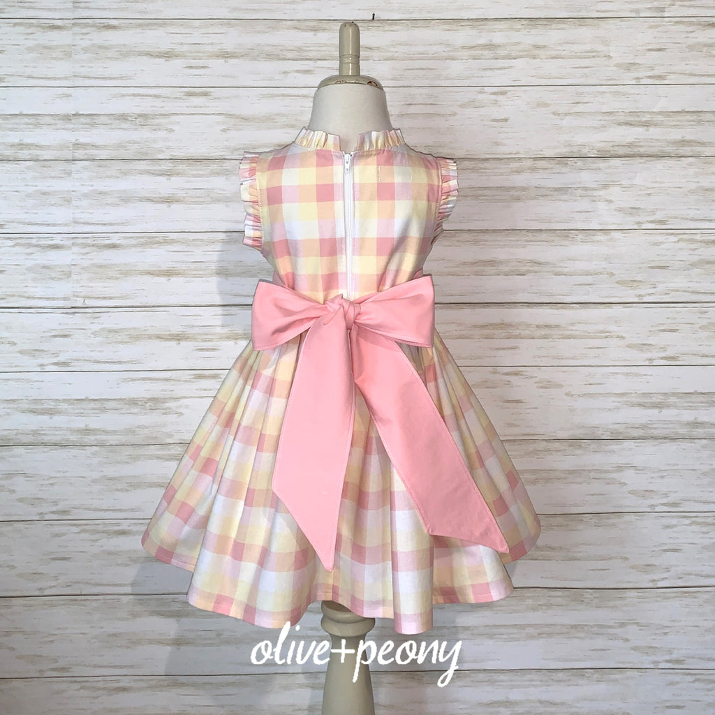 A simple sundress is so sweet in springtime! Our lightweight cotton dress is available in three plaid colorways: lavender, pink, and mint. They are vintage length, a shorter cut designed to hit inches above the knee. The neckline and armholes are trimmed with a dainty fabric ruffle, and the center bodice and skirt panel are cut on the bias. These dresses zip closed with a large back bow.